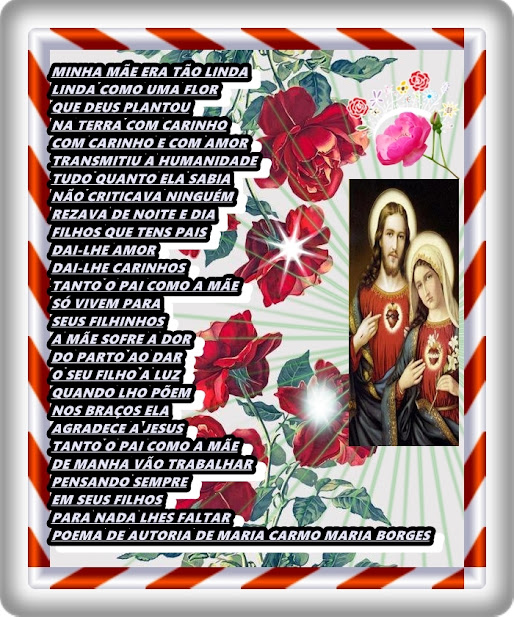 Menino olha para o Céu, Tu vais ver a estrelinha a brilhar Sabes o que ela está a fazer Está para ti e para as tuas priminhas a falar, Quando tu jogas à bola As estrelinhas também estão lá em cima, No Céu, contigo, a jogar. Também quando rezas a JESUS, elas batem palminhas Porque tu sabes rezar e também as tuas priminhas. Vítor Hugo quando os meninos falam asneiras As estrelinhas estão a chorar, Vão abrir a porta do céu E vão ao menino Jesus Pedir para não os castigar, Vítor Hugo, quando os meninos falam mal, Jesus chora Dás-lhe um beijinho agora Porque o menino Jesus é muito lindo E tem muita bondade, para ti Teus pais, teus avós e toda a tua família Ele tem muita amizade Vítor Hugo, tu tens muito amor No teu coração lindo para dares Á tua avó Idalina e teu avô Vitorino. Vítor Hugo, hoje és pequenino, mas estás a crescer Um dia que sejas homem esta história melhor vais compreender, Guarda, meu lindo menino, com toda a tua emoção Porque eu também a escrevi contigo no coração. Eu gosto muito das crianças que tão pequeninas Já têm DEUS no coração pois, Por Deus e pela ‘a Nossa Senhora da Conceição. Tu vais ver a estrelinha a brilhar Sabes o que ela está a fazer Está para ti e para as tuas priminhas a falar, Quando tu jogas à bola As estrelinhas também estão lá em cima, No Céu, contigo, a jogar. Também quando rezas a JESUS, elas batem palminhas Porque tu sabes rezar e também as tuas priminhas. Vítor Hugo quando os meninos falam asneiras As estrelinhas estão a chorar, Vão abrir a porta do céu E vão ao menino Jesus Pedir para não os castigar, Vítor Hugo, quando os meninos falam mal, Jesus chora Dás-lhe um beijinho agora Porque o menino Jesus é muito lindo E tem muita bondade, para ti Teus pais, teus avós e toda a tua família Ele tem muita amizade Vítor Hugo, tu tens muito amor No teu coração lindo para dares Á tua avó Idalina e teu avô Vitorino. Vítor Hugo, hoje és pequenino, mas estás a crescer Um dia que sejas homem esta história melhor vais compreender, Guarda, meu lindo menino, com toda a tua emoção Porque eu também a escrevi contigo no coração. Eu gosto muito das crianças que tão pequeninas Já têm DEUS no coração pois, Por Deus e pela ‘a Nossa Senhora da Conceição. Autoria: Maria do Carmo Borges VÓZ DE MÃE A FALAR para mim todos os dias são iguais foram anos a viver com esses dias iguais trabalhava ora a ria hora chorava tudo sempre iguais, mas um dia ao acordar senti-me diferente uma estranha aurora trouxe-me naquele dia uma linda estrela era um azul mais brilhante que deixou nas minhas mãos pequenas e frágeis o maior e doce encanto vindo do alto do céu na minha mente ficaram gravados para sempre todos os esses dias em que recebi estas tão belas estrelas vidas do alto do céu de mansinho com choro com dor com alegria e com um infindável amor os meus olhos têm e vão ter para toda a minha eternidade esse acontecimento da minha vida terrena que para mim é eterna que transformou a minha vida as minhas mãos a minha mente e todo o meu ser tenho sempre esse espelho na minha alma que me ilumina noite e dia na explosão dos meus sonhos que são as quatro estrelas da minha vida mais as estrelas que desse fruto de amor estão no regaço do meu coração os meus queridos netos Deus dou graças por estes maravilhosos presentes hoje vejo a minha imagem ao espelho e encontro o meu rosto enrugado os cabelos brancos, mas já não sei qual e a imagem certa pois já nada mais em desperta nunca me esqueço da longa verdade dos tempos de outrora e de todas as feridas que o tempo me trouxe assim como uma dor bem sentido pego na caneta e com a vontade de escrever e alma de poeta que Deus me deu e olhando que nada sou não sou nada em nada fui valorizada perco a vontade de escrever tudo o que na alma tenho para dizer e deixar escrito para bem meditar tenho a noite por companheira que me ajuda e é a primeira a dar-me o perdão o amor e a deixar-me viver sempre com deus no espírito para levar a minha cruz fiz-me heroína do caminhar com fé e vencer ate o fim todo o sofrimento que me foi entregue em testamento na minha vida terrena para ser alcançada na vida eternado mundo nada nosso é tudo cá fica sim tudo o que sofremos o bem que fazemos o perdão que damos e o arrependimento do mal que fazemos tudo isso e o que levamos para entregar nas mãos de deus só isso tem valor para cada um de nós porque a vitoria a vitoria chegara no seu dia este e o mundo que todos sonhamos em sermos amados respeitados e nunca humilhados sobre a luz do infinito mas não é o mundo que sonhamos porque existem seres humanos que não nascem com essa mente de amar, mas sim de mal tratar e então tudo se modifica, mas aí em me envolvo com as rosas brancas da paz meu filho apenas com o teu coração quero escutar as palavras do meu e do teu pensar e de todos os teus irmãos foste a primeira estrela que Deus pôs nas minhas mãos que vivas sempre comigo assim como os teus irmãos amem Autoria: Maria do Carmo Borges MÃE PALAVRA DE AMOR 🙏😘🌹🌹❤